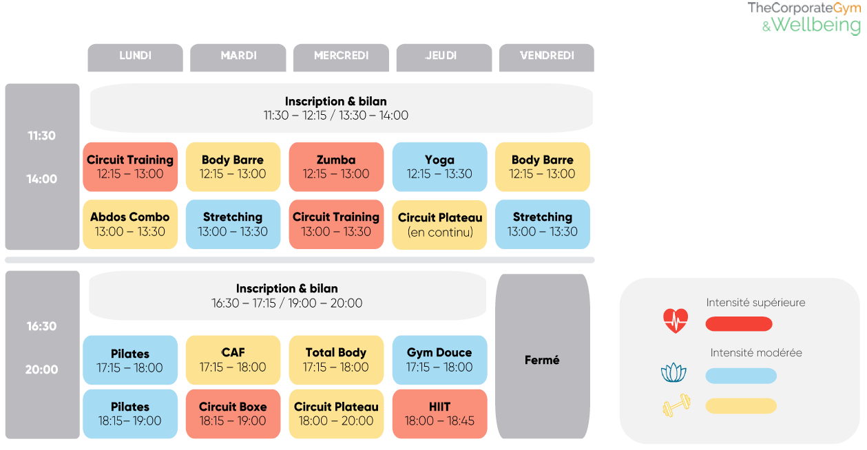 - Gym Douce : Cours tourné vers la prise de conscience du corps, la mobilité et la détente musculaire.